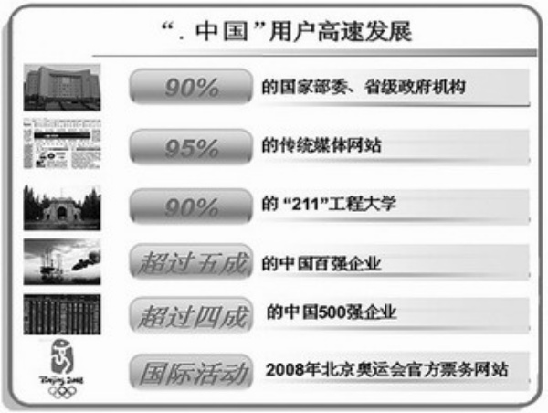 在未来两年内,国内的主流网站都将使用“.中国”域名。使用“.中国”域名访问互联网,将成为我国网民的主要网络访问方式。