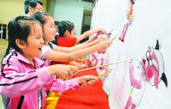 左图 5月28日,孩子们在学习演皮影戏。当日在北京展览馆举行的首届国际青少年文化·艺术教育用品博览会吸引了众多学生和家长,孩子们在这里学习中国传统文化知识,度过有意义的端午节假日。  新华社记者 杨 光摄