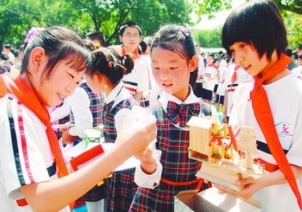 6月1日,北京新华百货广场,北京市小学生代表向来自地震灾区的儿童赠送礼物,与他们结成“一对一”好朋友。当天,来自四川地震灾区的126名儿童和北京小学生代表举行庆祝“六一”活动。