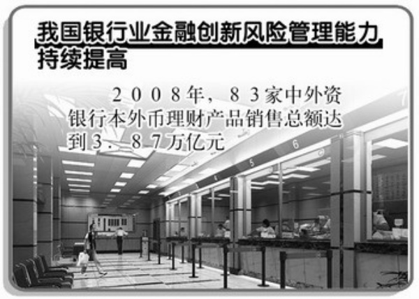 据银监会数据显示,随着金融创新活动审慎推进,银行业产品创新和服务能力稳步增强。2008年,83家中外资银行本外币理财产品销售总额达到3.87万亿元。银行卡、电子银行和衍生产品交易业务等稳健发展;商业银行设立基金管理公司试点工作平稳推进;商业银行设立租赁公司、参股信托公司等也取得重要进展。 (郑 劝)