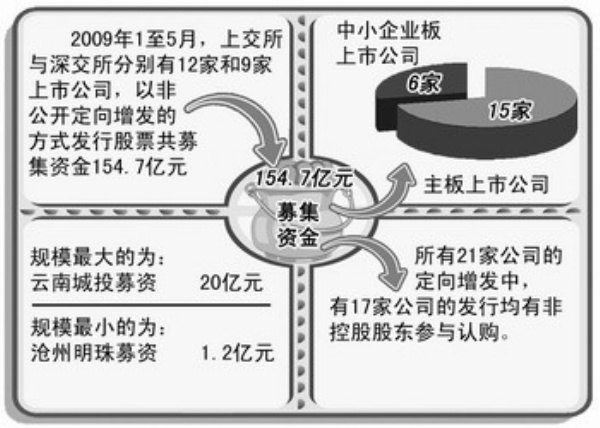 沪深证交所数据显示,今年前5个月,沪深两市共有21家上市公司以募集资金为目的进行了再融资,总募集金额达到154.7亿元。在所有21家公司的定向增发中,有17家公司的发行均有非控股股东参与认购,其中,公募投资基金、证券公司、信托公司、社保基金、QFII、保险公司等专业投资机构参与了12家上市公司的定向增发。 (郑 劝)
