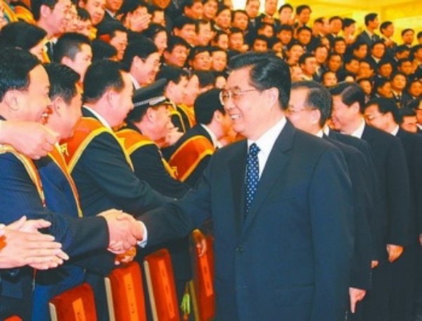 上午9时30分,当胡锦涛等中央领导同志来到人民大会堂北大厅同出席会议的代表们见面时,全场响起了热烈的掌声。胡锦涛等高兴地同代表们合影留念。