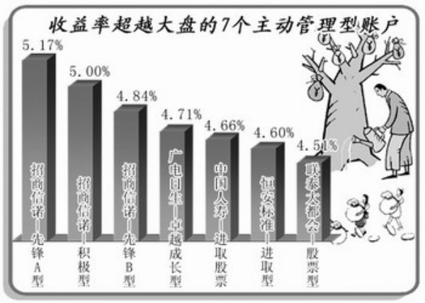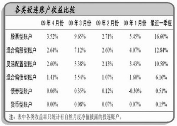 下图:数据显示,4月份股票型投连险账户全部获得正收益。图为有自然月度净值披露的28个股票型账户的收益情况中7个主动管理型账户收益超越同期大盘。