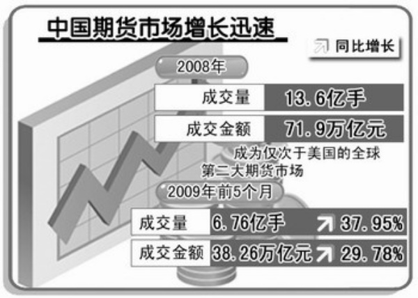 | 期货市场近年来始终保持较快的增长速度,目前已成为全球第二大期货市场,今年前5个月成交合约6.76亿手,成交金额38.26万亿元,同比分别增长37.95%和29.78%。