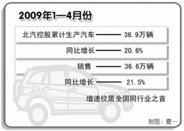 2007年,北汽整体销量69.41万辆,虽然位列全国第五,但1.3%的增速远远落后于行业平均水平,16.4亿元的利润额也与上汽、一汽、东风有不小的差距。2008年,北汽开始奋力追赶。虽然受到国际金融危机和国内汽车市场低迷的影响,北汽整体销量仍然达到77.18万辆,同比增长11.2%,总销量增长速度高于行业4.5个百分点。今年前4个月,北汽控股的产销数据让人刮目相看。1—4月份,北汽控股累计生产汽车36.9万辆,同比增长20.6%,销售36.6万辆,同比增长21.5%,增速位居全国同行业之首。