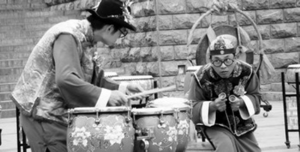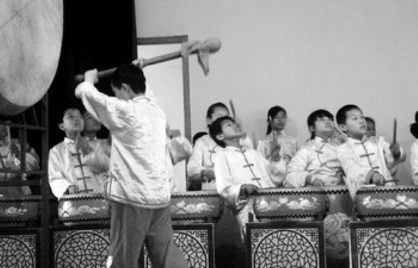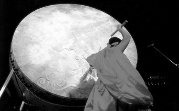 图1:来自山西新绛县的绛州鼓乐团表演《普天乐》。图为擂大鼓的场景。