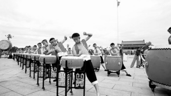 图2:为绛州鼓乐团在天安门广场的“迎奥运”演出,这曲《黄河船夫》曾获得全国首届农民会演金穗奖。