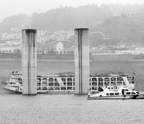 6月8日,上行货船驶过三峡船闸前的靠船墩。
