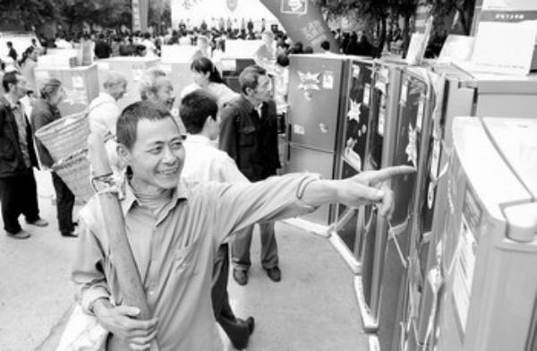 下图:为确保进入农村市场的家电产品安全可靠、符合强制性产品认证适用标准要求,国家认监委要求各认证机构和实验室严格控制认证、检测质量。图为四川武胜县沿口镇农民在送家电下乡产品展销会上选购电冰箱。