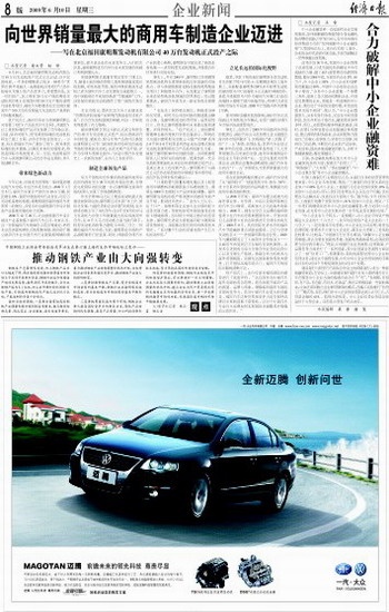 今年以来,中国成为世界惟一保持强劲增长的汽车市场,北京汽车成为亮点。2009年1月至5月,福田汽车累计产销汽车23.5万辆,同比增长8%,稳居中国商用车行业首位。而百万发动机基地的构建,将继续稳固福田商用车世界第二的地位,并成为北京新能源汽车设计制造产业基地发展的有力支撑。