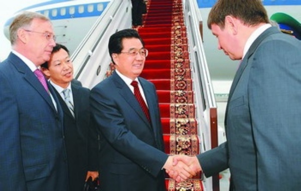 当地时间19时50分,胡锦涛乘坐的专机抵达叶卡捷琳堡科利佐沃机场。胡锦涛在机场受到俄罗斯外交部副部长博罗达夫金等的热情迎接。