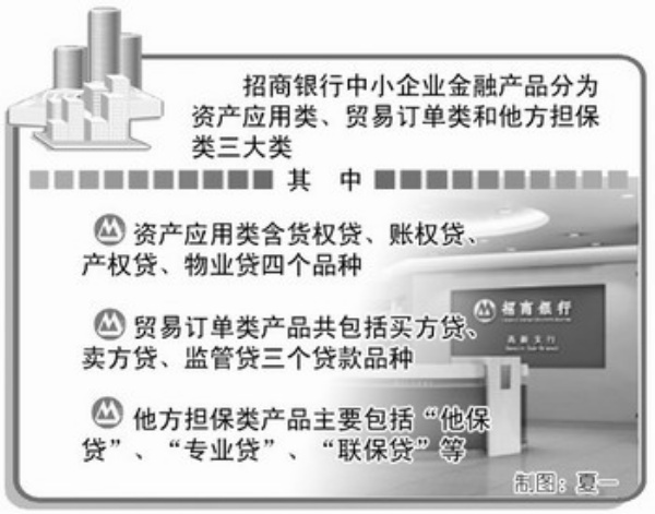 作为全国首创的中小企业专营机构,招商银行小企业信贷中心根据中小企业自身资产和经营特点,按照“自助、友帮、互助”模式将贷款产品分为三大类:资产应用类、贸易订单类和他方担保类。