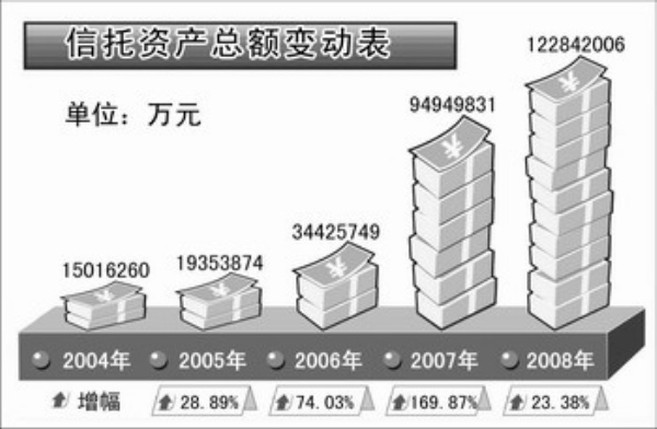 据邢成介绍,自2004年信托公司开始披露年报,他们就一直在进行跟踪研究。前不久50家信托公司2008年年报披露完毕,经过统计分析可以看到,信托行业发展仍然基本稳定,核心指标实现平稳增长,信托资产规模去年仍然保持了总量的增加,实现了高达23.38%的增速。