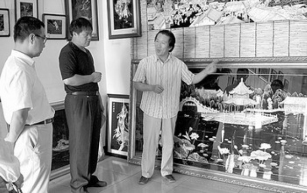 下图 河北省工艺美术大师杨丙军(右一)在向本报记者介绍他刚刚创作完成的芦苇工艺画《古莲花池》。