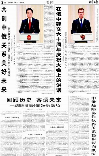 回顾历史 寄语未来———记胡锦涛主席出席中俄建交60周年庆祝大会