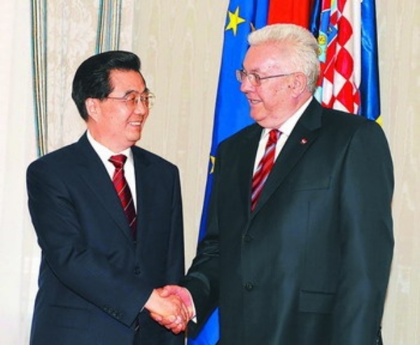胡锦涛表示,中克虽然相距遥远,但两国人民结下了深厚传统友谊。中克建交17年来,在双方共同努力下,两国关系取得长足发展。中方尊重克罗地亚人民选择的发展道路,理解克罗地亚融入欧洲一体化进程的努力。中方重视对克关系,将继续巩固两国传统友谊,扩大友好交往,推动中克全面合作伙伴关系向前发展。