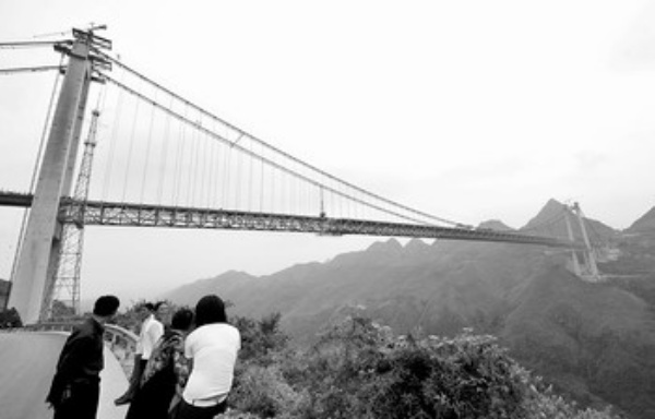 6月21日,几位行人在观看坝陵河特大桥。坝陵河大桥是沪瑞国道主干线(上海至云南瑞丽)贵州境内镇宁到胜境关高速公路上的一座特大型桥梁,大桥主跨1088米,桥面距峡谷谷底约370米。大桥建成后,将使从黄果树风景区到关岭县城的里程缩短20公里,车程从半小时缩短到5分钟。