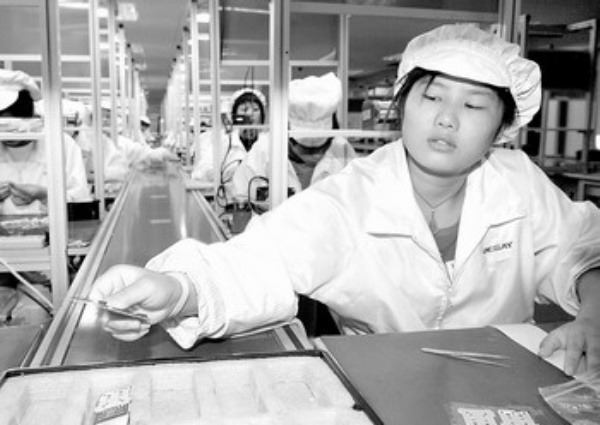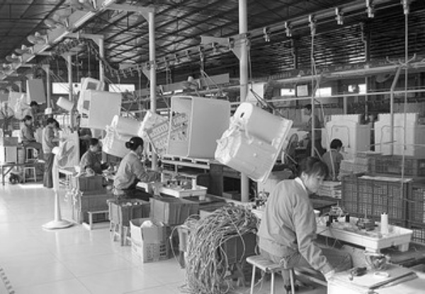 中图:四川超迪电器实业有限公司工人们正在安装电子元件组装冰箱。