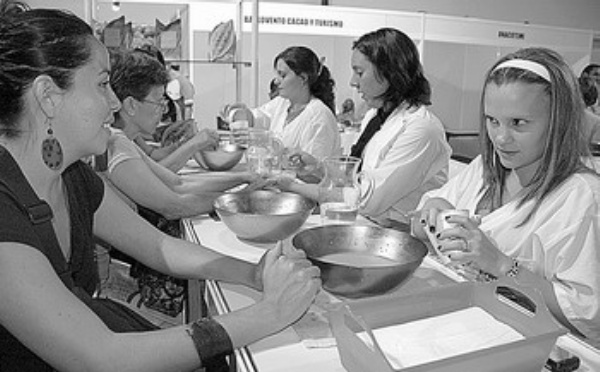 6月21日,在委内瑞拉首都加拉加斯举办的巧克力博览会上,工作人员帮助消费者体验“巧克力疗法”。据称这种疗法可帮助减压,促进皮肤健康。委内瑞拉6月19日至21日举办巧克力博览会,展示该国的可可种植行业、巧克力加工业和巧克力文化。委内瑞拉年产可可约1.5万吨,其中9000吨出口,主要出口到日本、荷兰、德国等地。 新华社发