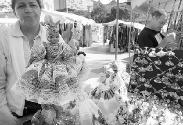 6月21日,一名商贩在巴西圣保罗的一个周末集市上售卖手工艺玩偶。每逢周末,当地手工艺品制作者和商贩聚集在位于圣保罗市中心的共和广场,举办周末工艺品集市,吸引许多当地人和游客前来参观购物。 新华社发