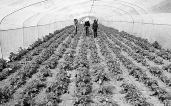 6月23日,甘肃省渭源县河里庄村村民在马铃薯原种田里除草。