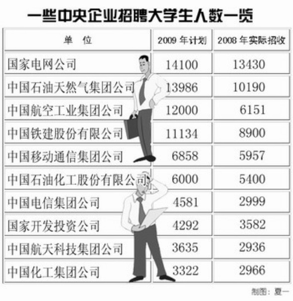 编者的话 眼下正是高校毕业生就业的关键时期。受国际金融危机的影响,今年应届大学毕业生就业问题凸显,就业形势严峻。“保增长,中央企业要挑大梁;促就业,中央企业同样要冲在前面!”面对严峻的就业形势,广大中央企业承担社会责任,着眼人才储备,千方百计扩大应届毕业生的招收数量。国资委近日表示,其下辖的中央企业有99户今年计划招收应届大学毕业生20.3万人,比去年实际招收人数增长7.08%。