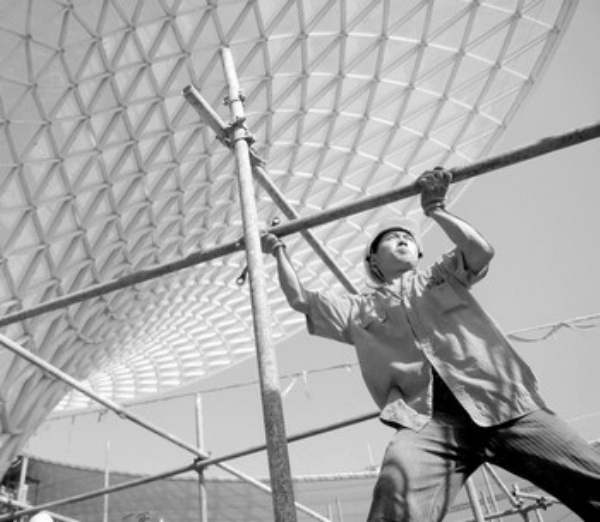 6月25日,工人在上海世博园区施工现场。上海世博会倒计时300天即将到来之际,工人们在高温天气下抓紧施工,在确保工程质量的前提下,争取早日完成施工任务。