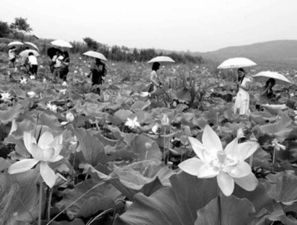 6月28日,游人打伞在雨中赏荷,别有一番风情。近日,湖北嘉鱼县珍湖休闲农庄3000亩荷花竞相开放,慕名前来的游人流连在花海之中,尽情领略盛夏荷花别样的娇媚。 新华社记者 张燕辉摄