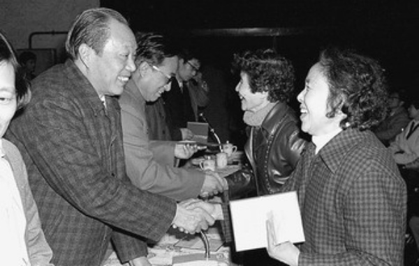 图5 一九八七年一月二十三日,董寅初同志为受到表彰的归侨、侨眷好家庭代表颁奖。