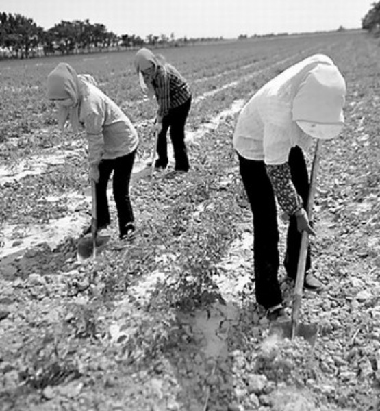 图1 6月3日,宁夏石嘴山市惠农区礼和乡星火村农民在实施规模化经营的番茄田里除草。