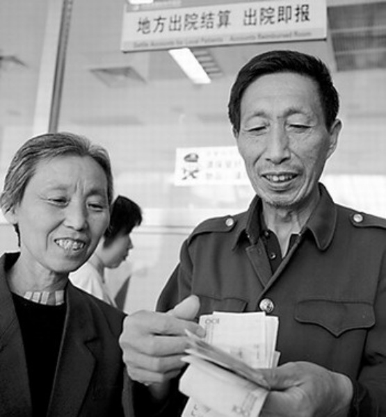 图2 4月29日,河北辛集市农民郭吉明(右)在石家庄市白求恩国际和平医院领到妻子武巧芬住院就医时的补偿费用。 新华社记者 杨世尧摄