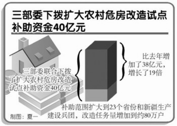 与去年相比,今年安排的扩大农村危房改造试点补助资金增加了38亿元,增长了19倍;补助范围由贵州省扩大到河北等23个省份和新疆生产建设兵团;补助改造任务量由4万户增加到约80万户。实施农村危房改造,不仅有效改善了农村困难群众的居住条件,带动了关联产业的发展,促进了返乡农民工的就业,同时也激活了农村消费市场,拉动了社会总投资的增长。 (孙 勇)