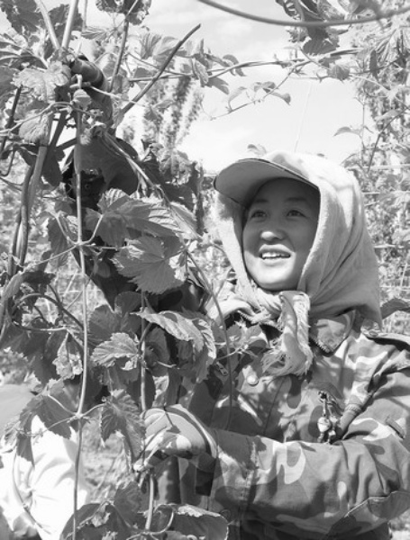 6月25日,甘肃玉门市绿峰酒花公司酒花基地的种植工人正在布网。玉门市通过企业建园、政府补贴等多种形式,共落实啤酒花种植5499亩,占计划任务的110%,拓宽了农民的增收渠道。
