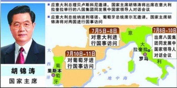 新华社北京7月2日电 (记者廖雷 侯丽军) 国家主席胡锦涛下周将出席在意大利举行的八国集团同发展中国家领导人对话会议并对意大利、葡萄牙进行国事访问。外交部官员2日表示,中方希望此次对话会议能够推动建立南北之间真正平等、互利、共赢的新型伙伴关系。