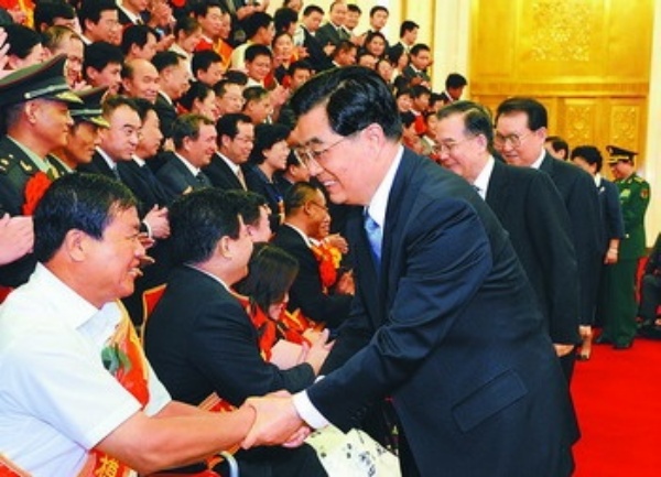 上午9时30分,当胡锦涛等中央领导同志来到人民大会堂北大厅同出席会议的代表们见面时,全场响起热烈的掌声。胡锦涛等高兴地与代表们握手,并同大家合影留念。