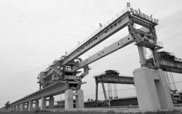 正在架设中的石(家庄)武(汉)高铁客运专线河南段工程(7月2日摄)。 国家铁路重点建设工程石(家庄)武(汉)高速铁路客运专线河南段架梁进入关键阶段。中铁四局从改进架梁工艺出发,从5月开始架梁,到目前已经完成了108孔梁的架设。石(家庄)武(汉)高速铁路客运专线是国家四纵四横重点铁路网线京广高速客运专线的组成部分,工程将于2011年完成通车,设计