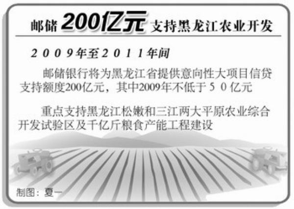 本报讯 记者喻剑报道:2009年至2011年间,邮储银行将为黑龙江省提供意向性大项目信贷支持额度200亿元,重点支持黑龙江松嫩和三江两大平原农业综合开发试验区及千亿斤粮食产能工程建设。另外,截至2009年5月末,邮储银行辽宁省分行共为8万多农户和个体工商户发放贷款51亿元,其中小额贷款6.5万户、41.84亿元;质押贷款1.9万户、8.8亿元。