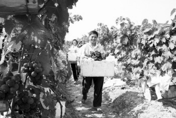 7月1日,江西赣州市兴国县埠头乡枫林村兴隆葡萄园基地里,员工们正在采摘葡萄。近年来,兴国县建立起烟叶、葡萄等一批农产品生产基地。目前,该县已涌现农业主导产业专业村88个,成立专业合作社36个,农民收入稳步增长。 赖福鑫摄