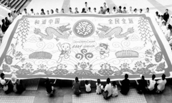 7月5日,在济南市泉城广场,人们展示以“和谐中国,全民全运”为主题的巨幅剪纸作品。当日是第十一届全运会倒计时100天,人们用巨幅剪纸作品表达对全运会的美好祝福。