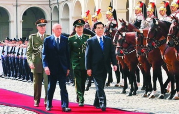 上图:7月6日,国家主席胡锦涛在罗马出席意大利总统纳波利塔诺举行的欢迎仪式。这是胡锦涛主席在纳波利塔诺总统陪同下检阅仪仗队。新华社发
