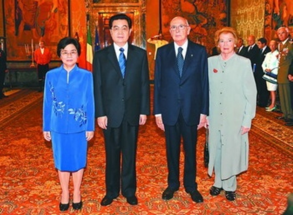 下图:7月6日,意大利总统纳波利塔诺在罗马总统府广场举行隆重仪式,欢迎中国国家主席胡锦涛访问意大利。这是欢迎仪式上胡锦涛主席和夫人刘永清与纳波利塔诺夫妇合影。新华社记者 樊如钧摄