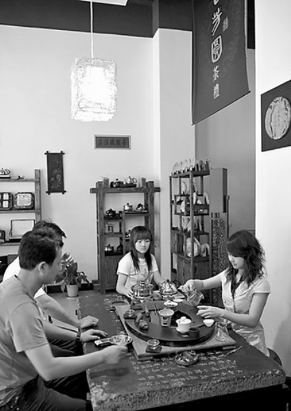6月18日,客人在景德镇一家茶坊品茗。
