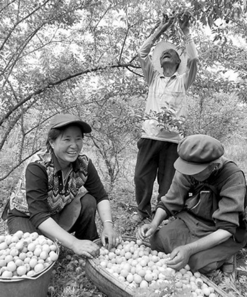 玉龙纳西族自治县拉市乡余乐村纳西族果农杨学兰(左)一家在采摘青梅,准备交售给公司(6月17日摄)。