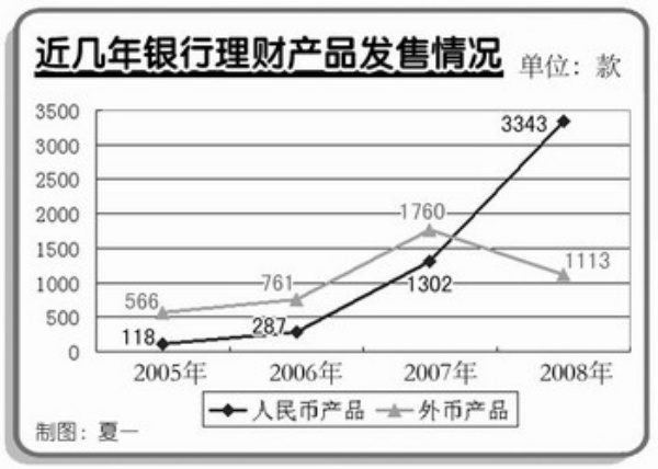 统计数据显示,在2005年银行理财产品发展初期,人民币产品发行了118款,外币产品发行了566款。2006年,银行理财产品开始加快发展步伐,实现了几近翻番的增长,当年人民币产品发行了287款,外币产品发行了761款。到了2007年,银行理财产品的发行数量呈现出爆发性的增长,人民币产品发行1302款,外币产品发行1760款。