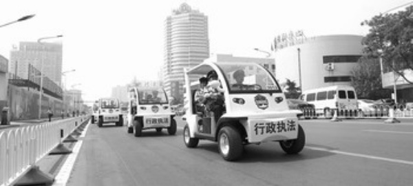 图为保定市城管执法人员乘坐绿色环保电瓶车在城市主干道上巡逻。 程 法摄