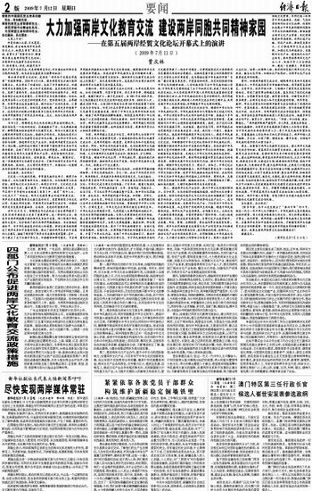 大力加强两岸文化教育交流 建设两岸同胞共同精神家园———在第五届两岸经贸文化论坛开幕式上的演讲