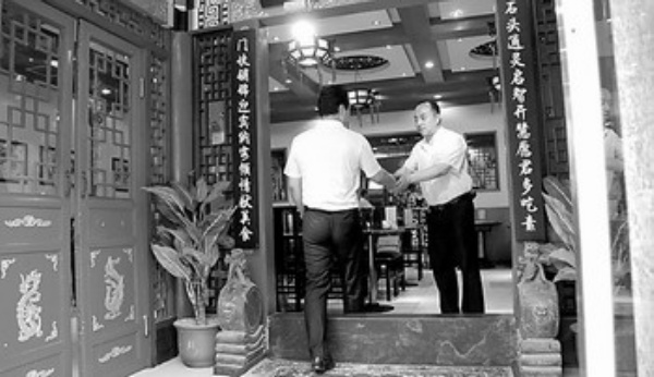 图1:已有100余年历史的天津石头门坎素包店,日前刚刚被天津市评为首批“津门老字号”企业。以前,店主人为防夏季雨水入店,在门口砌了一道石头门坎,久而久之,成了老店的特征。老店现在不断有新店开张,发展很快,现在的店主人张永利(右)最喜欢在老“门坎”前迎宾纳客,筹划未来。