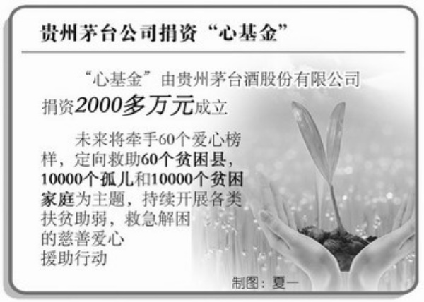 本报讯 由人民日报社、中国扶贫基金会、贵州茅台酒股份有限公司联合发起的“心基金”日前在京揭幕。“心基金”由贵州茅台捐资2000多万元成立。 (王 璐)
