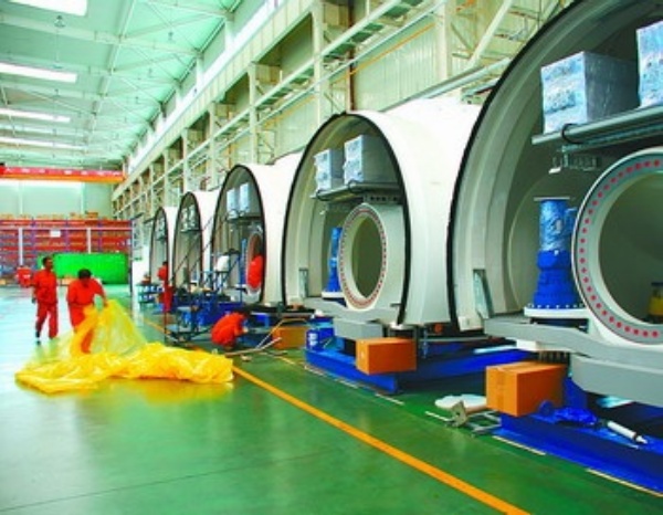 图2:在新疆金风科技股份有限公司生产车间,工人们正在检修风机机舱。 新华社记者 李晓玲摄
