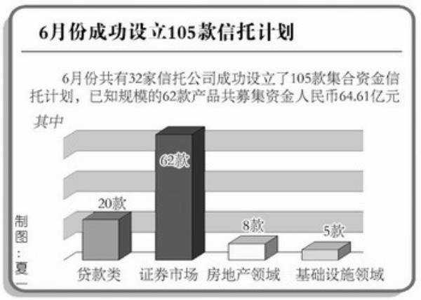 本报讯 6月份共有32家信托公司成功设立了105款集合资金信托计划,已知规模的62款产品共募集资金人民币64.61亿元。其中贷款类产品20款,投向证券市场62款,8款投资于房地产领域,5款投向基础设施领域。 (张 衍)